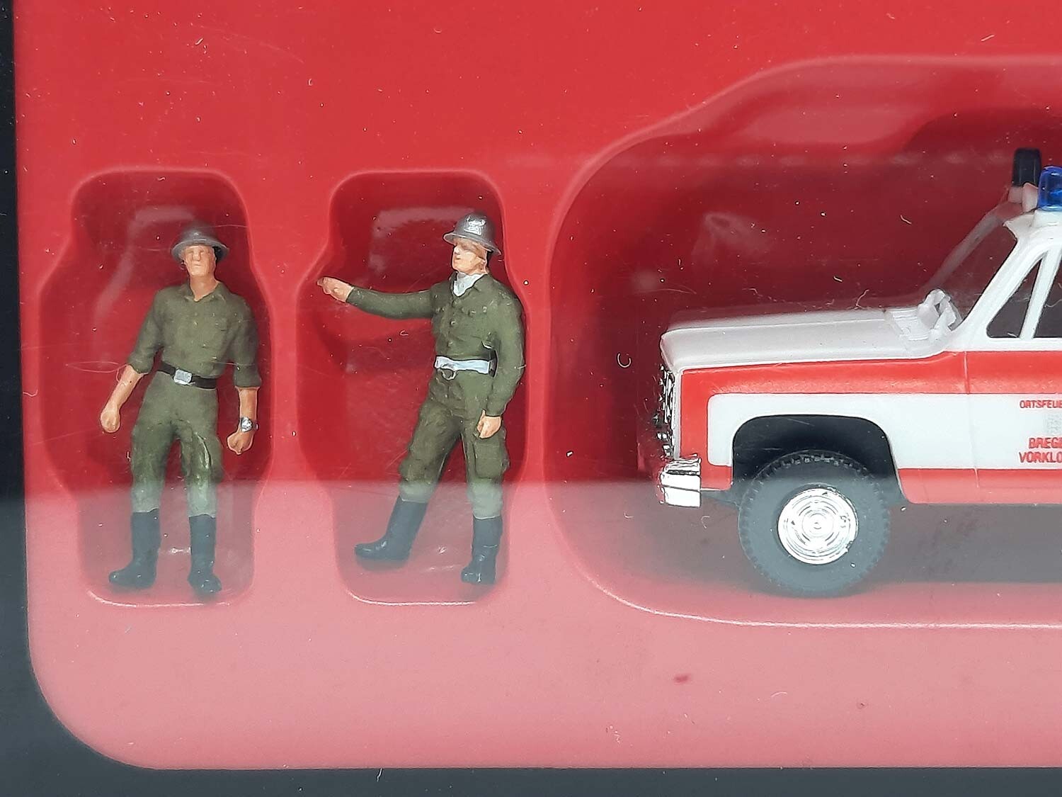 Kurzbeschreibung: Chevrolet Blazer Feuerwehr Bregenz Set + 2 Figuren | Gebrauchtes Modell aus der 19,99 Euro Collection Extrem seltenes Set in Kooperation mit dem ehemaligen Hersteller "Trident" und dem Hersteller "Preiser". Es handelt sich hier um eine Sonderauflage des C