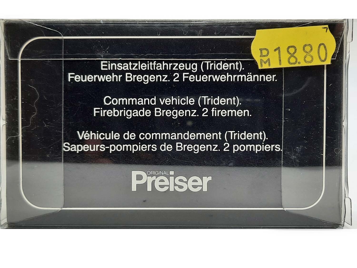 Extrem seltenes Set in Kooperation mit dem ehemaligen Hersteller "Trident" und dem Hersteller "Preiser". Es handelt sich hier um eine Sonderauflage des Chevrolet Blazer 4x4 der Feuerwehr Bregenz Österreich in Sonderlackierung und 2 österreichischen Feuerwehrmännern. Alles in OVP, sehr gut erhalten, Inhalt neuwertig - aus einer Sammlung