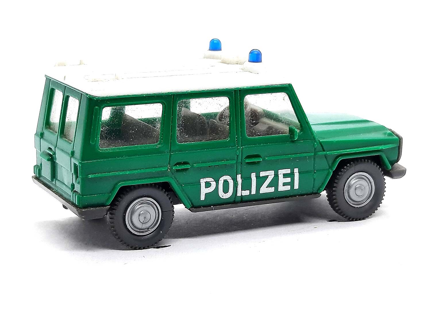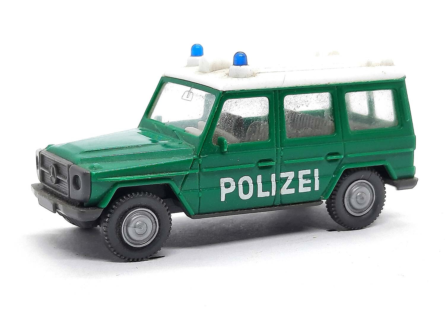 Kurzbeschreibung: Mercedes Benz G-Klasse Polizei altes Modell | Gebrauchtes Modell aus der 1,99 Euro Collection mit kleinen Macken: Eigentlich guter Zustand, aber das Modell ist an den Scheiben minimal verschmutzt