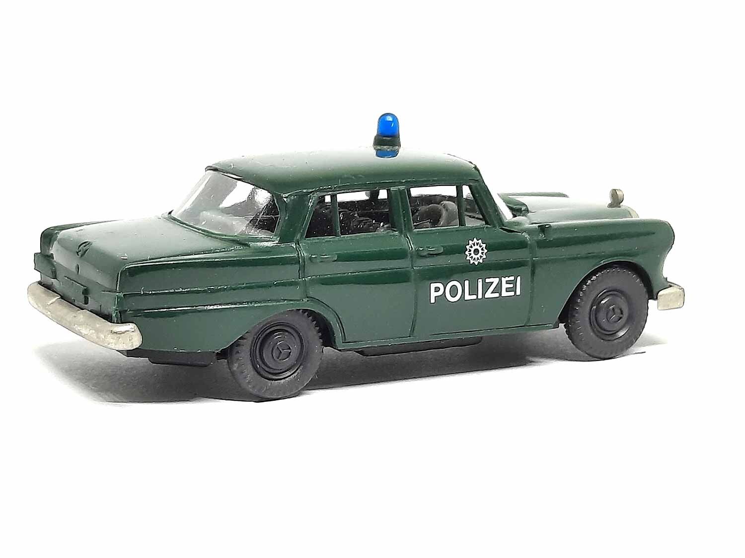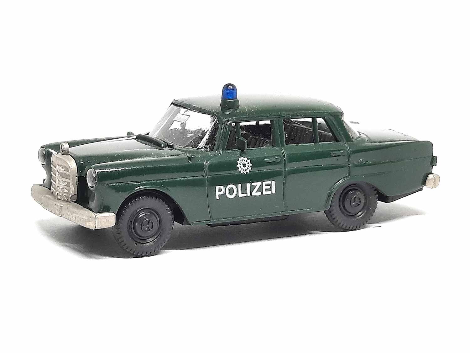 Kurzbeschreibung: Mercedes Benz Heckflosse Polizei Dunkelgrün | Gebrauchtes Modell aus der 2,99 Euro Collection Vitrinenmodell - Neuwertig, unbespielt, keine Kratzer etc, ohne OVP Hersteller: Brekina